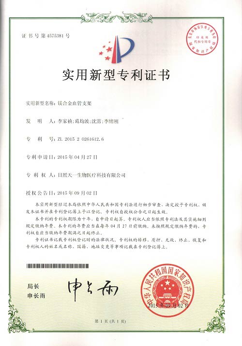 2015年度日照天一生物再次申請(qǐng)兩個(gè)發(fā)明專利,《鎂合金支架的處理液及處理方法》、《藥物緩釋鎂合金支架及其制備方法》,三個(gè)實(shí)用新型專利《充填式疝修補(bǔ)補(bǔ)片》、《藥物緩釋鎂合金支架》、《鎂合金血管支架》,目前發(fā)明專利已經(jīng)進(jìn)入實(shí)質(zhì)審查階段,并在中華人民共和國(guó)國(guó)家知識(shí)產(chǎn)權(quán)局網(wǎng)站上公布。三個(gè)實(shí)用新型專利已由中華人民共和國(guó)國(guó)家知識(shí)產(chǎn)權(quán)局授權(quán)并下發(fā)證書,目前公司已有三項(xiàng)發(fā)明專利,三項(xiàng)實(shí)用新型專利,專利權(quán)人均為日照天一生物醫(yī)療科技有限公司。