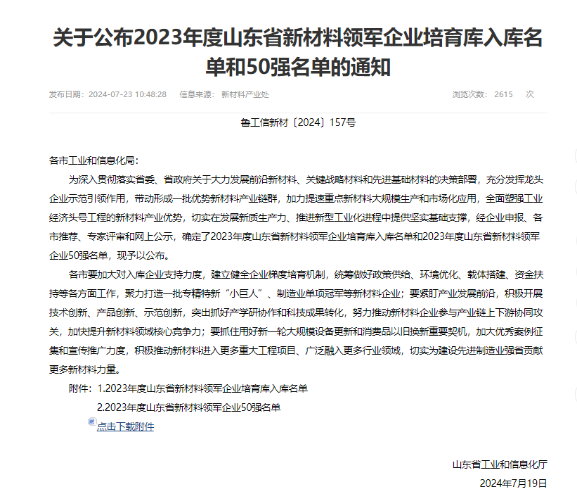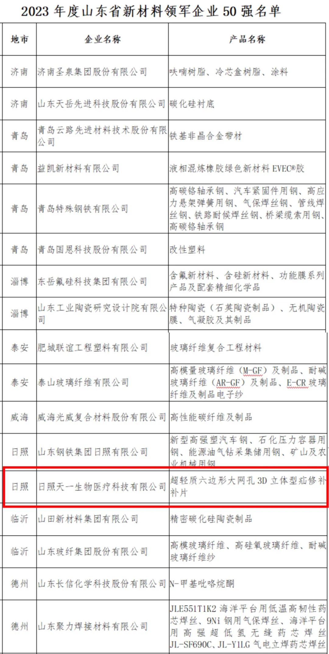 近日,山東省工業和信息化廳公布了2023年度山東省新材料領軍企業50強名單,日照天一生物醫療科技有限公司成功入選。