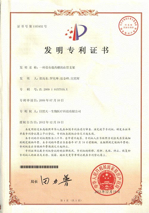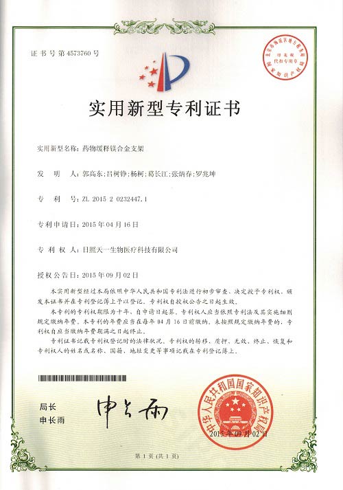 2015年度日照天一生物再次申請(qǐng)兩個(gè)發(fā)明專利,《鎂合金支架的處理液及處理方法》、《藥物緩釋鎂合金支架及其制備方法》,三個(gè)實(shí)用新型專利《充填式疝修補(bǔ)補(bǔ)片》、《藥物緩釋鎂合金支架》、《鎂合金血管支架》,目前發(fā)明專利已經(jīng)進(jìn)入實(shí)質(zhì)審查階段,并在中華人民共和國(guó)國(guó)家知識(shí)產(chǎn)權(quán)局網(wǎng)站上公布。三個(gè)實(shí)用新型專利已由中華人民共和國(guó)國(guó)家知識(shí)產(chǎn)權(quán)局授權(quán)并下發(fā)證書,目前公司已有三項(xiàng)發(fā)明專利,三項(xiàng)實(shí)用新型專利,專利權(quán)人均為日照天一生物醫(yī)療科技有限公司。